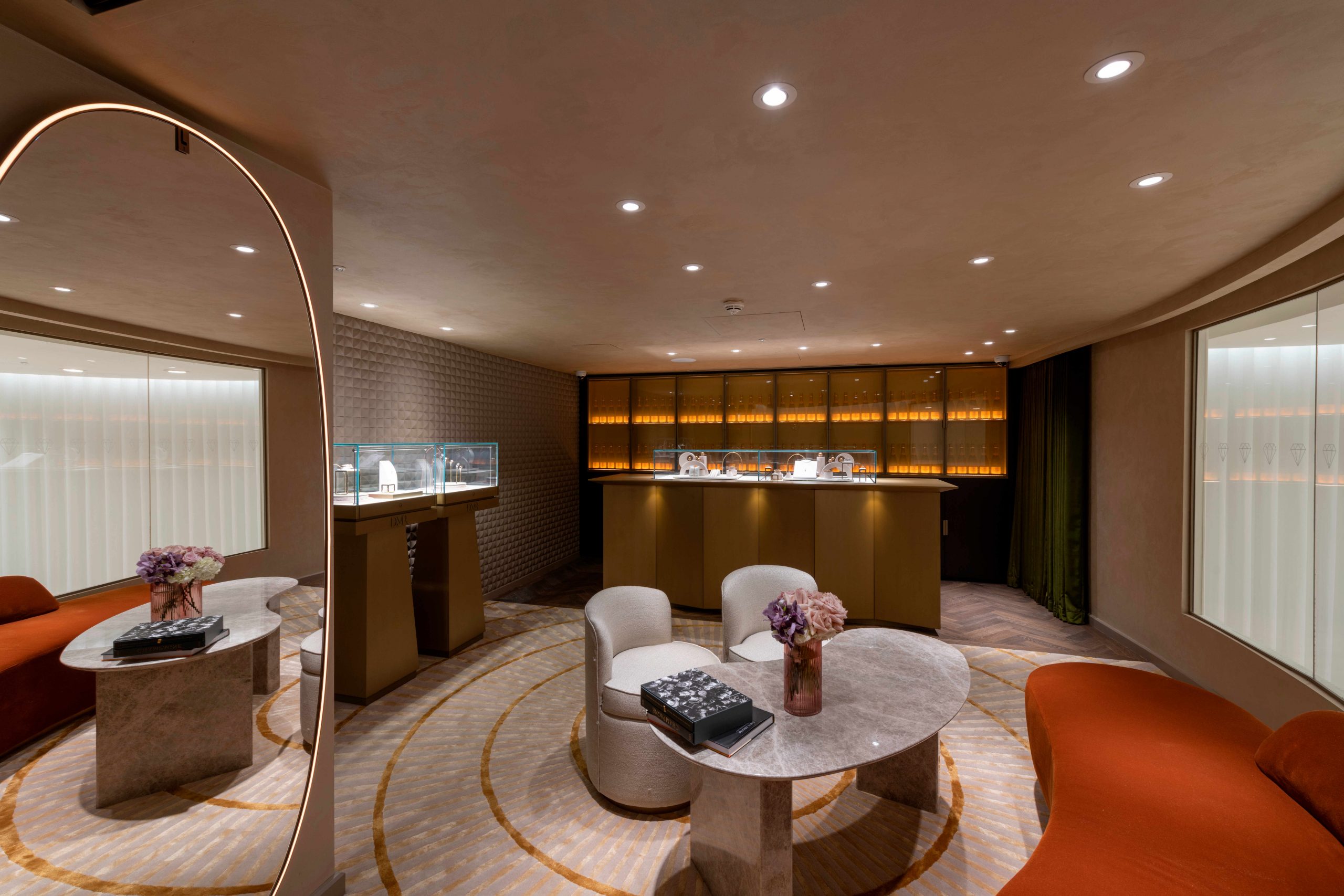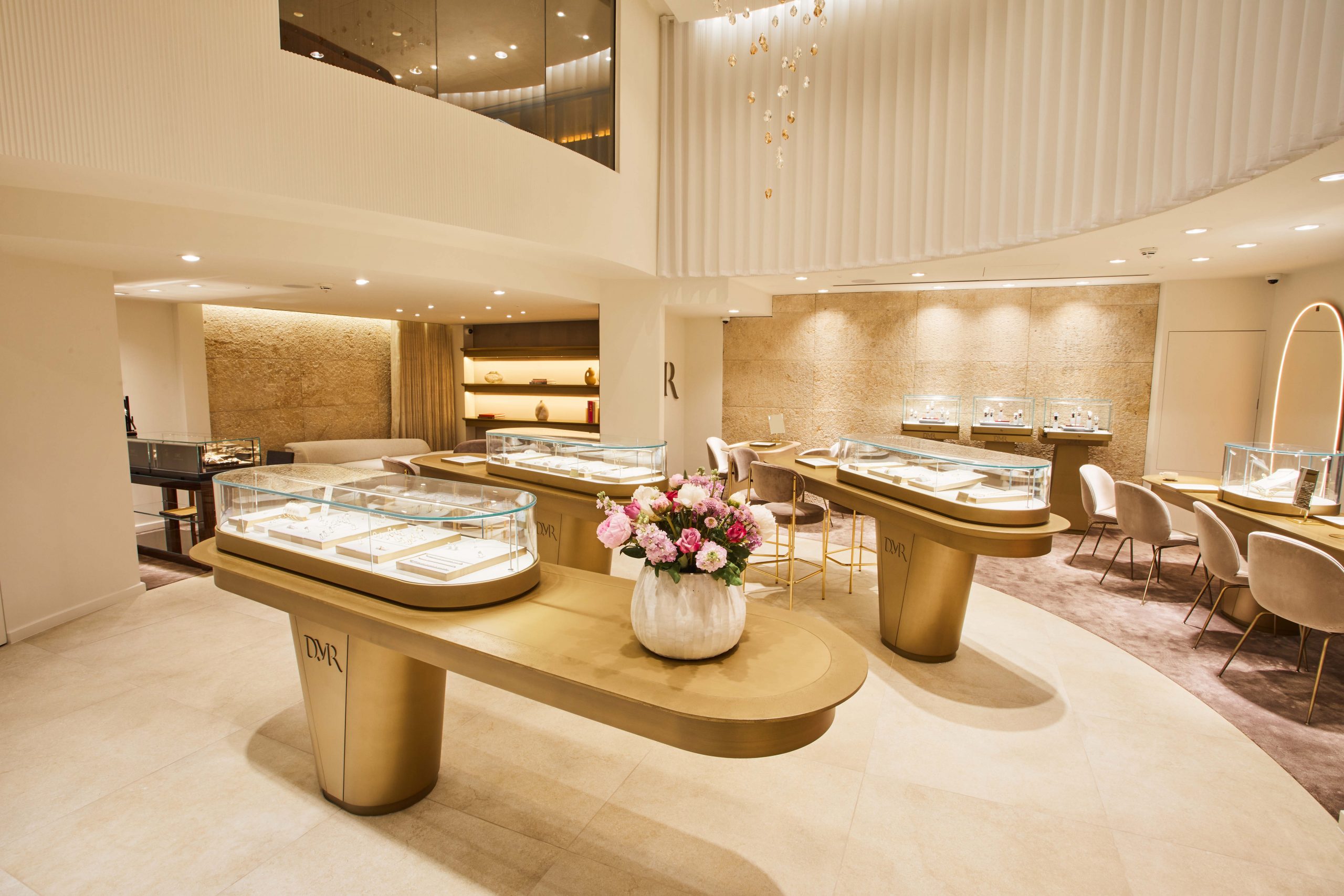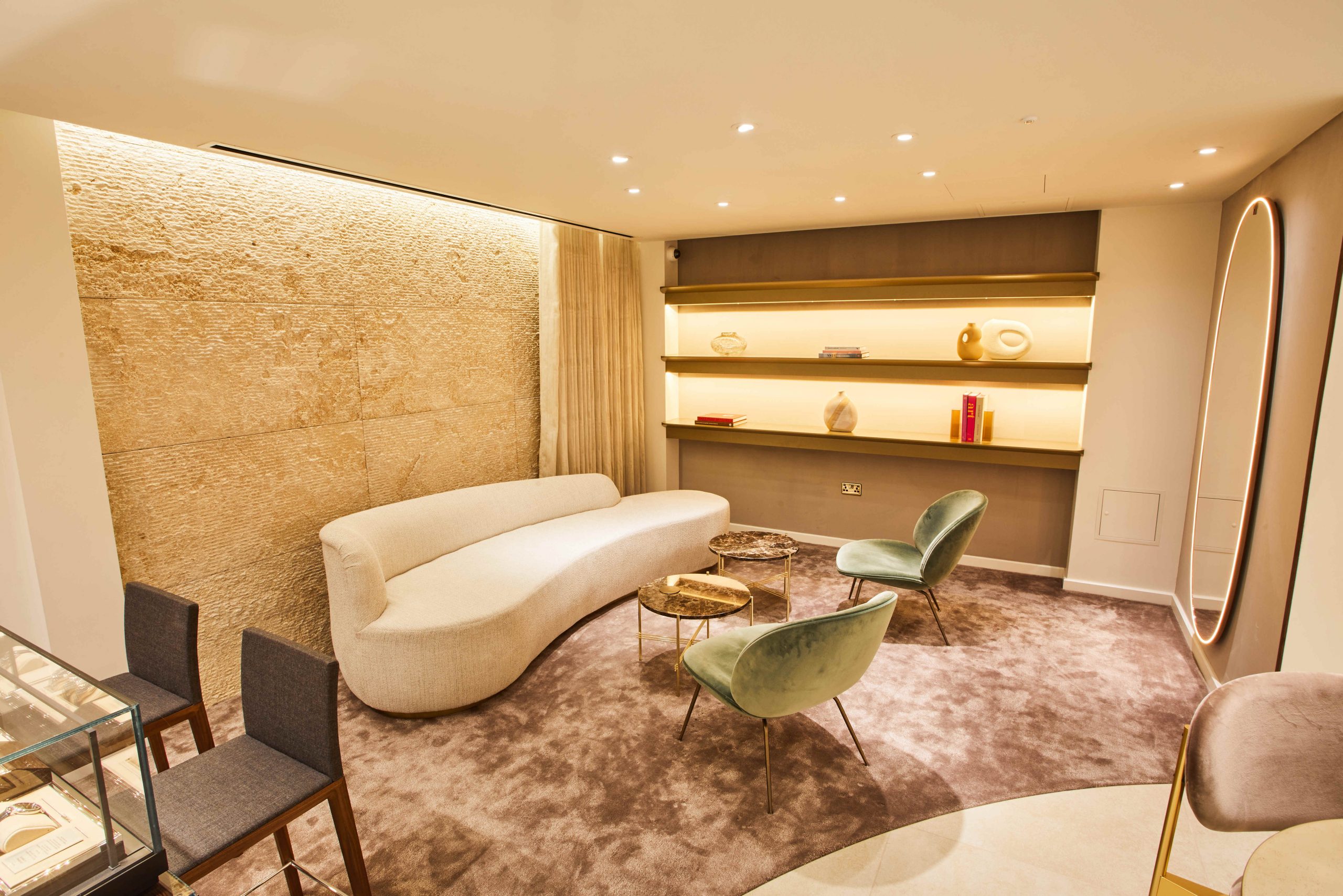 Cutter & Barr was asked to supply curtains and window treatments for the showrooms of the jewellery designer David M Robinson in Liverpool and Canary Wharf as well as for a concession within the Peninsular Hotel, Belgravia. The project included supplying a challenging brief of 80mm decorative wave curtains in a voile fabric to hang on a motorised curved track which stands 6.5m off the floor. The installation required a tower and an exacting number of cross diagonal measurements to ensure the hang was correct. We also designed further sets of curtains with tracks hidden behind the reveal: one in a fabric by Zimmer + Rohde and another in a rich matt emerald velvet.