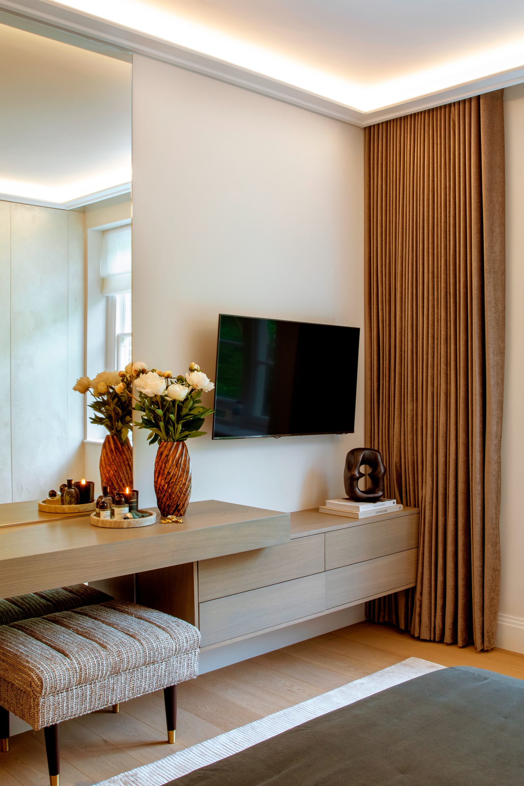 The coving was designed to deliberately disguise the header of the curtains, which helps to ensure no natural light comes through. Using soft and textured velvets, we produced double wave curtains for most of the bedrooms alongside roman blinds in a voile with a set of wave curtains for the final bedroom.